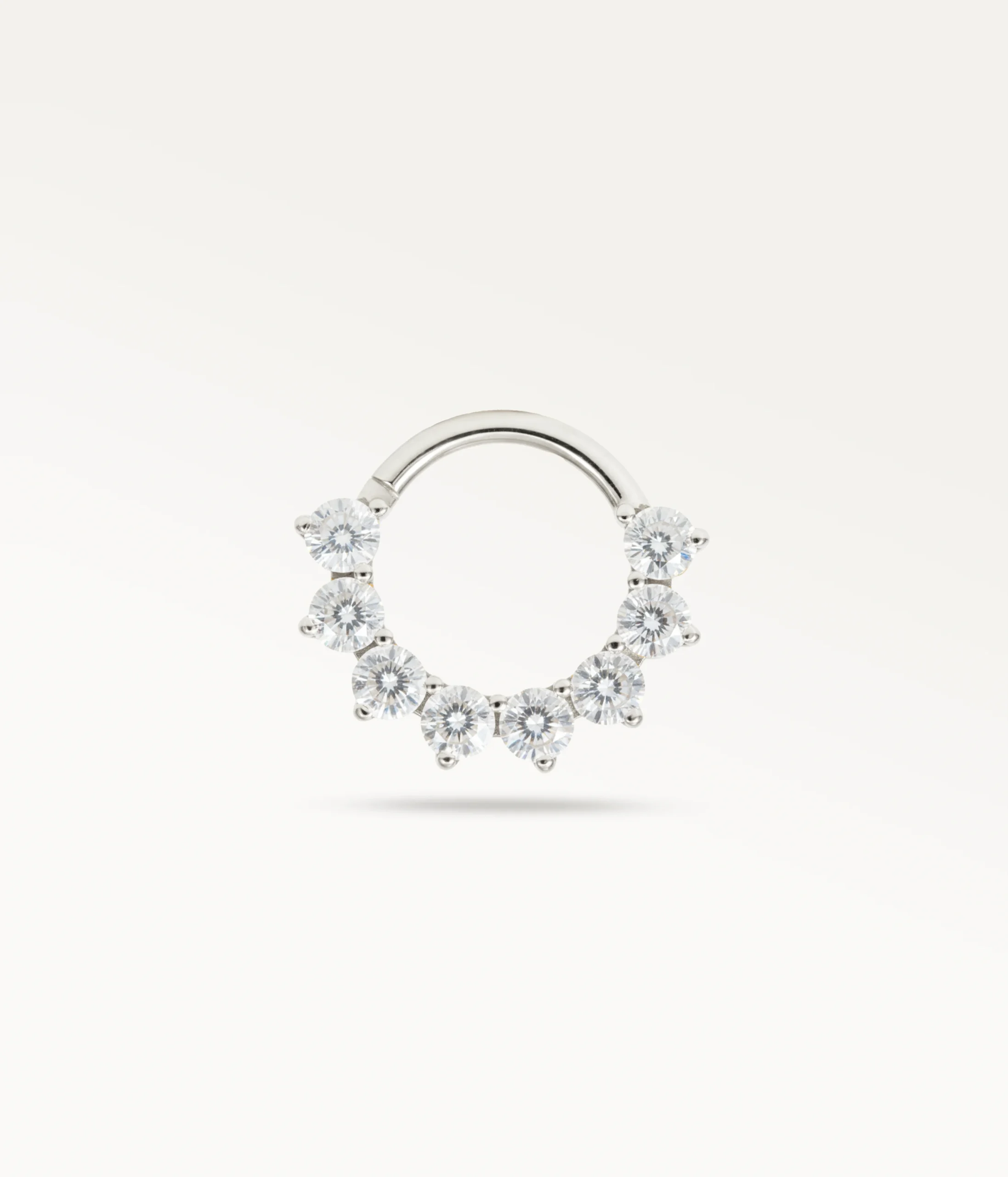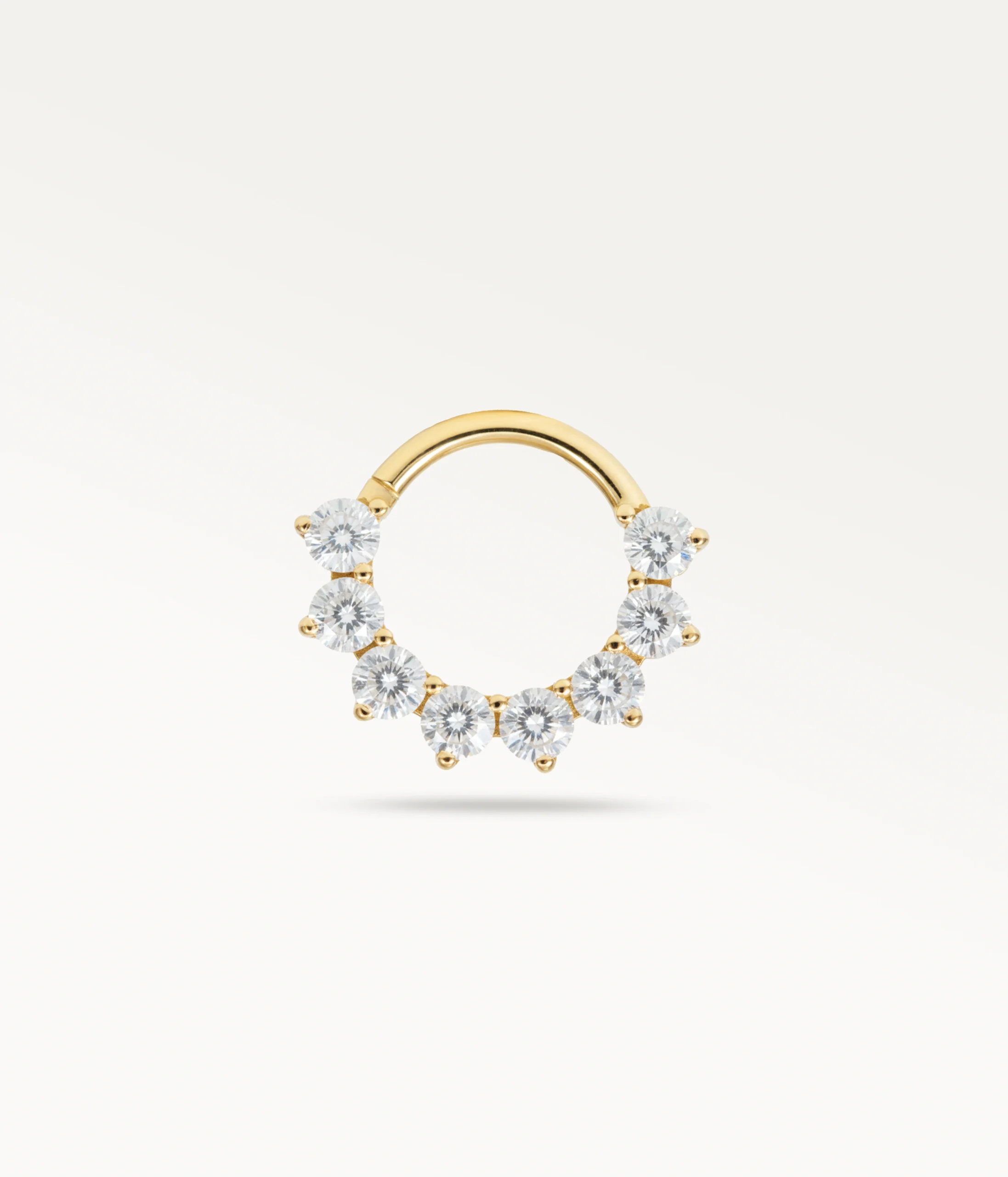 Composé de 8 pierres de qualité premium (6A) est l’un des anneaux les plus lumineux. C’est une pièce parfaite si vous avez peu de piercings car il habille à lui seul votre oreille.
