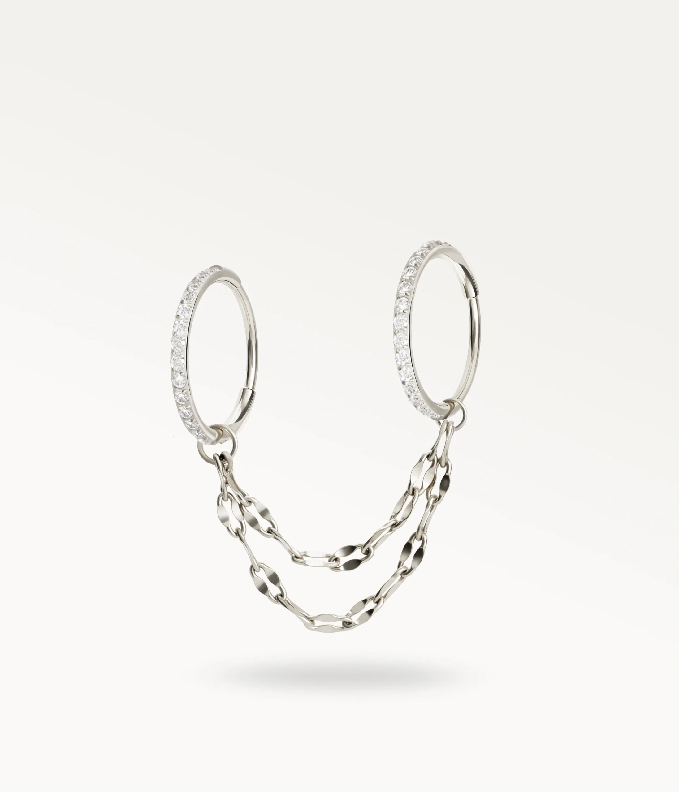 Nexus relie deux anneaux par deux chaînes sequin, connues pour leurs mailles plates et réfléchissantes. Ce choix crée un effet de brillance marqué : chaque mouvement du visage fait jouer la lumière sur les maillons, donnant au bijou une présence vivante et élégante.