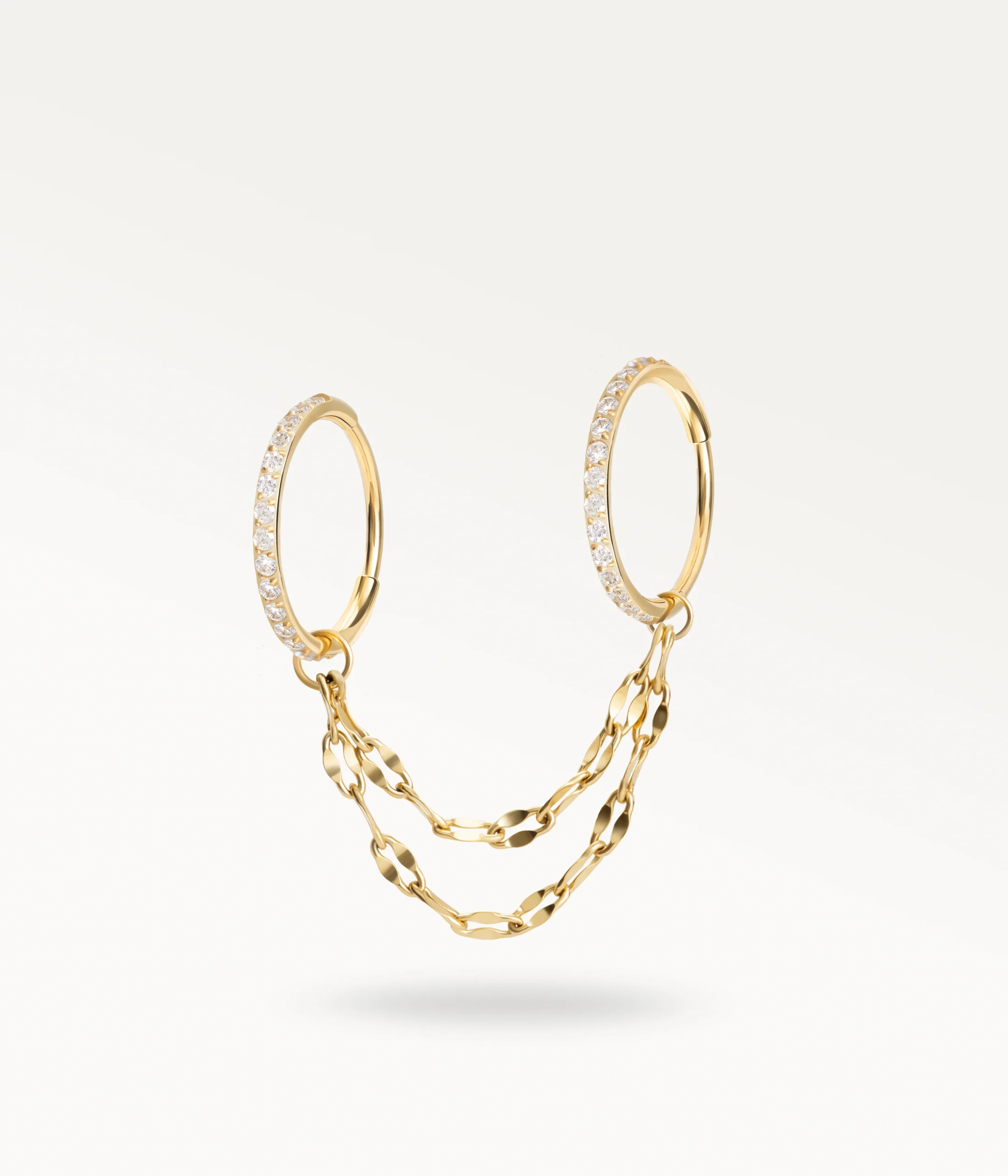 Les deux chaînes, légèrement décalées, ajoutent du volume et soulignent la ligne du lobe avec modernité. Pensée pour celles qui ont un double trou au lobe.