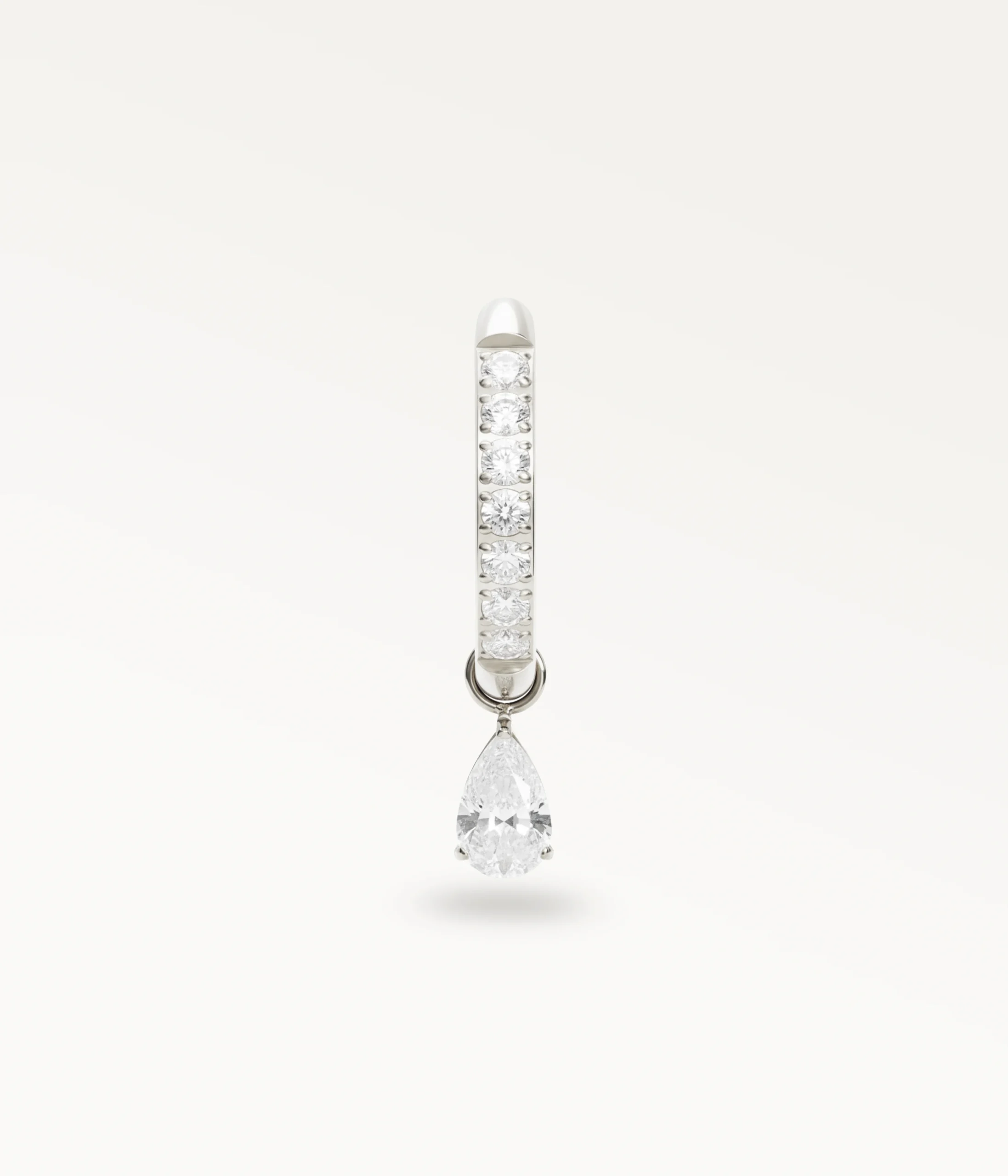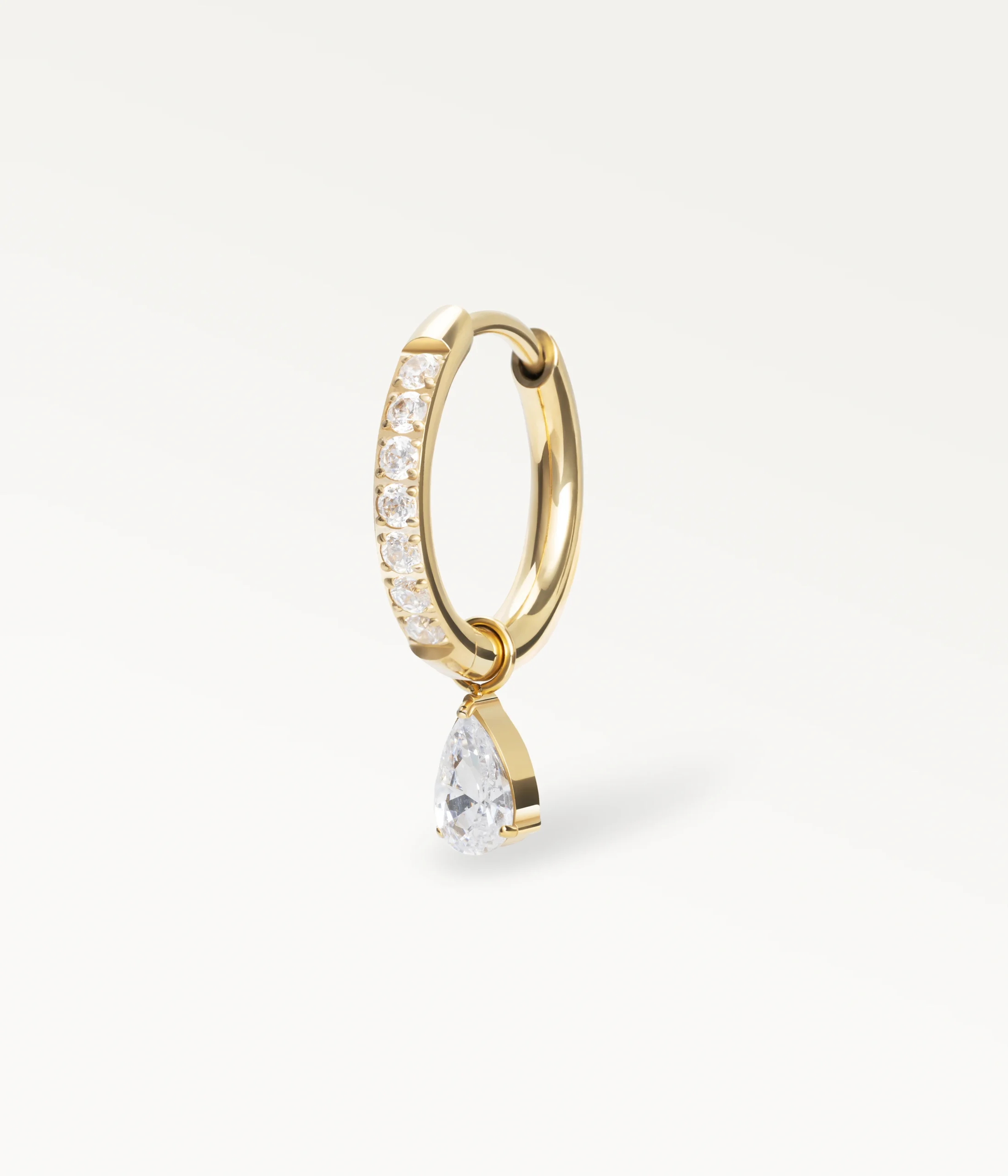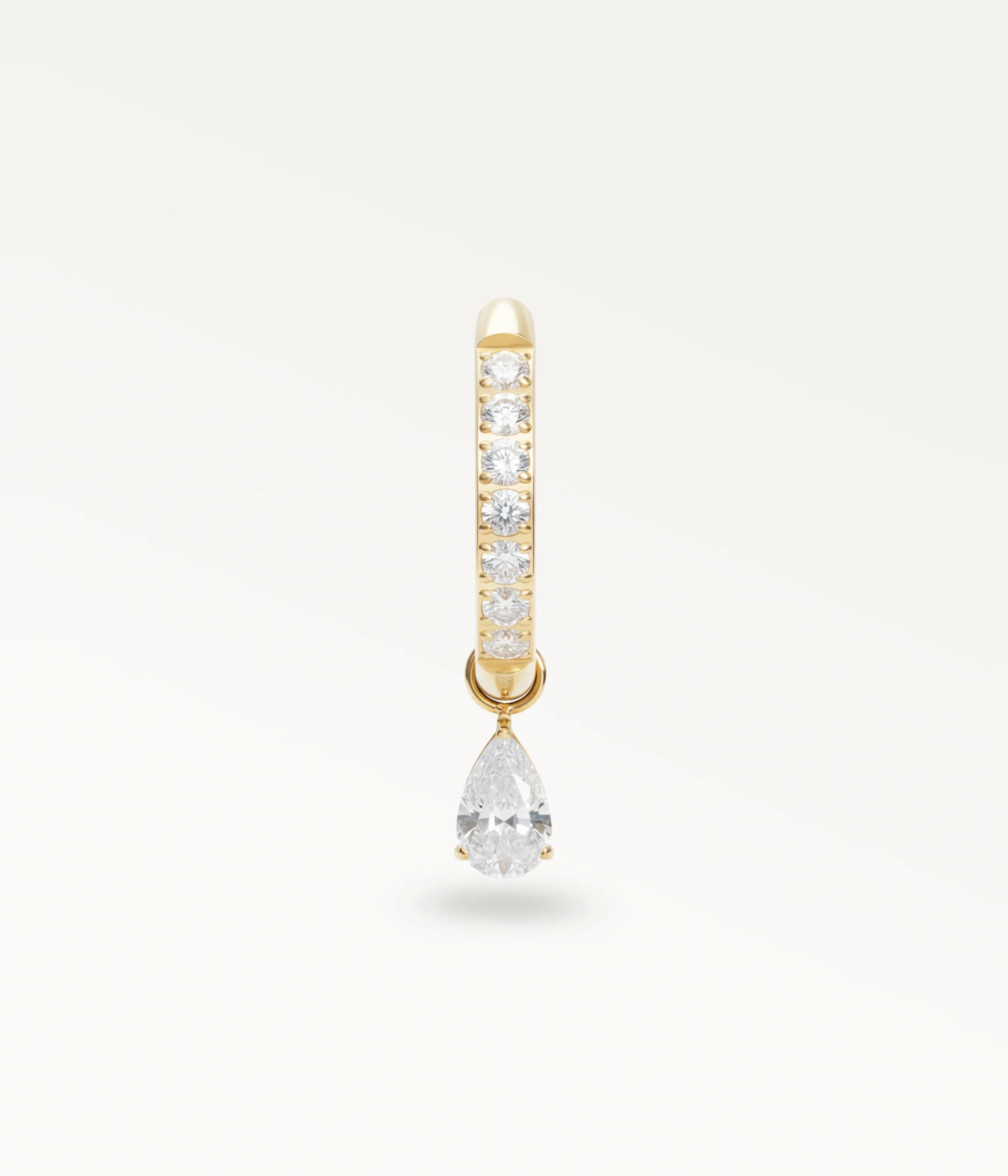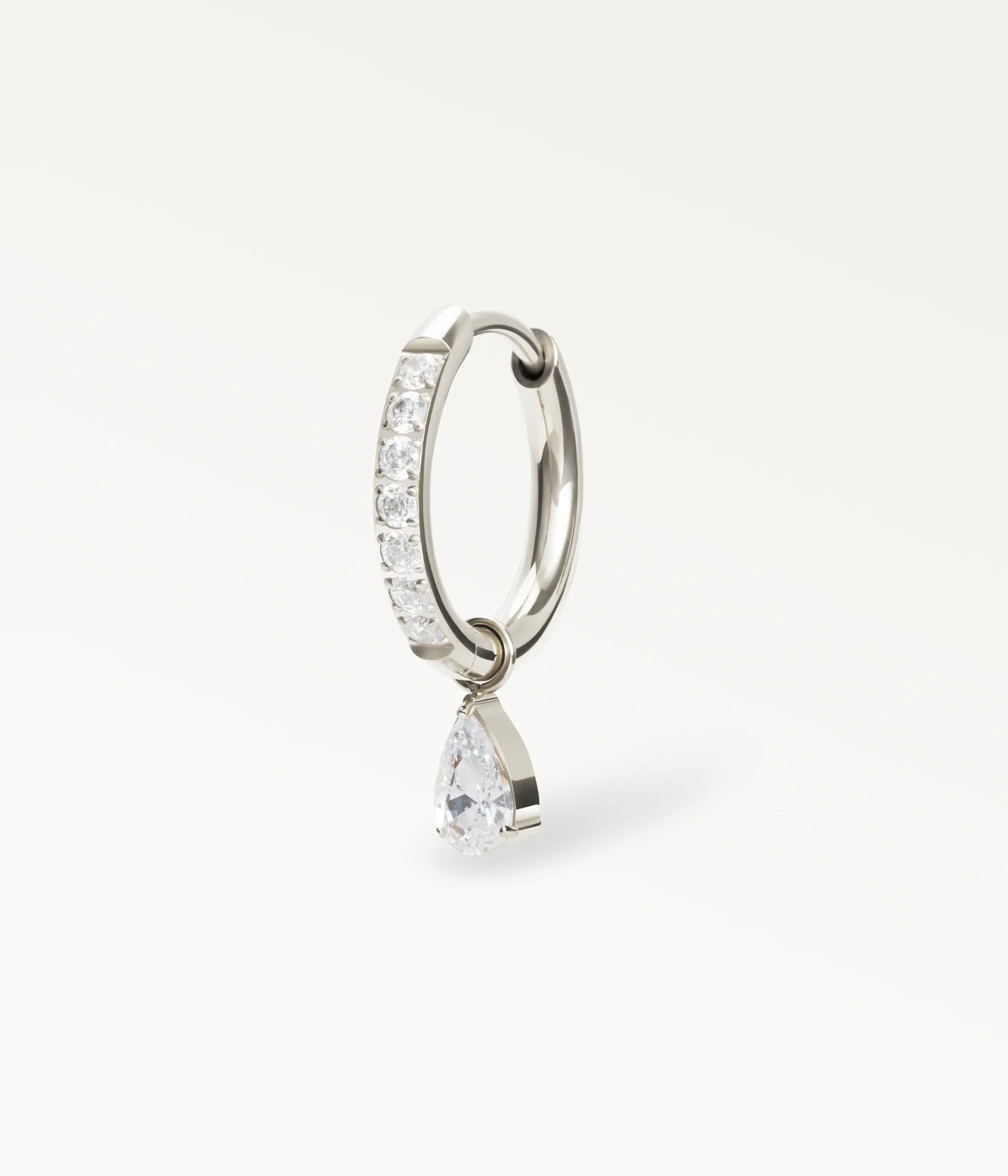Ce pendant en forme de poire allongée crée l’effet d’une goutte précieuse qui attire naturellement le regard. Porté sur le premier ou deuxième trou, il structure votre composition d’oreille avec élégance : son anneau pavé de zircons reflète la lumière à chaque mouvement, tandis que la pierre en poire ajoute cette touche raffinée sans alourdir.