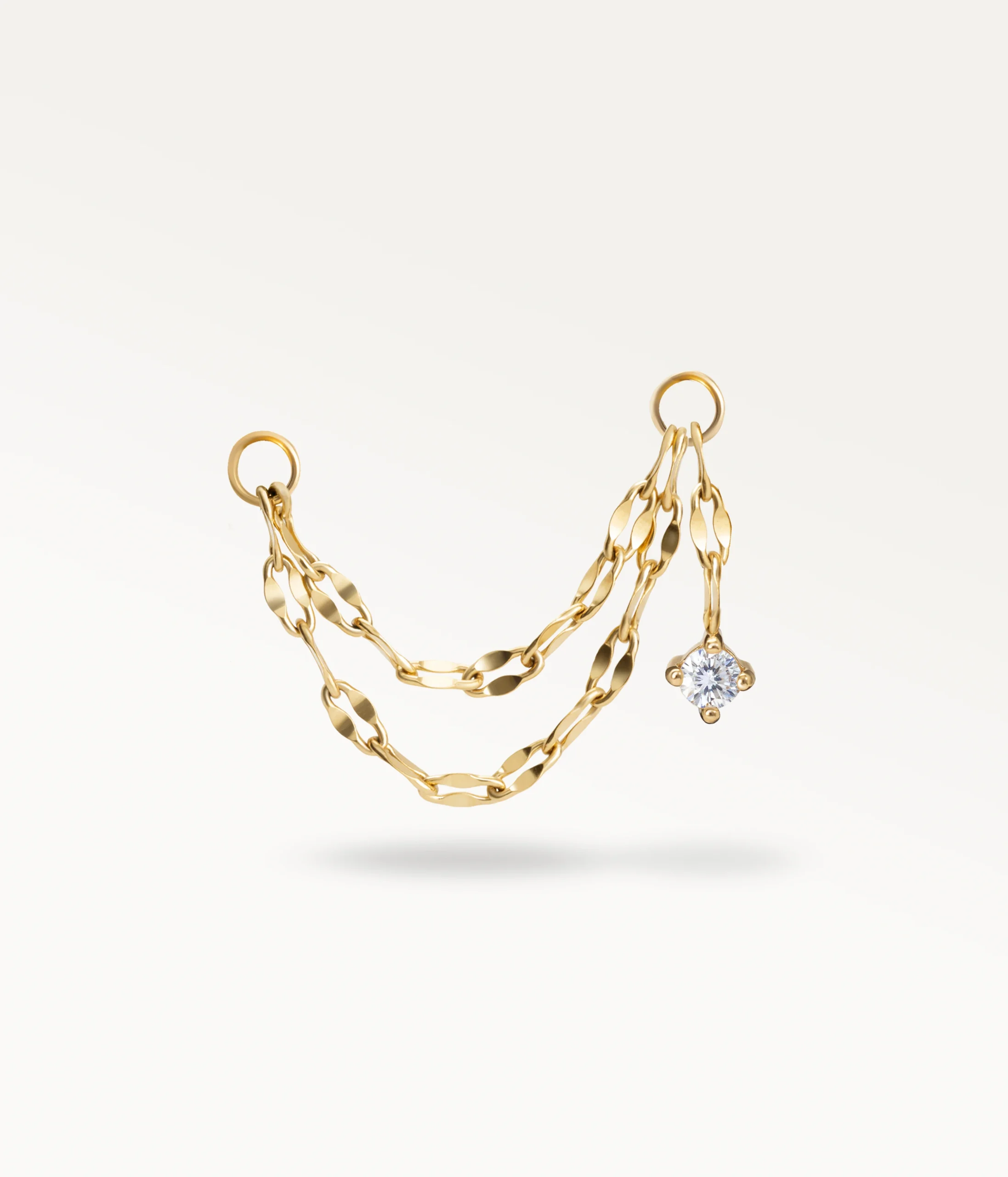 Ce piercing double chaîne se distingue par la finesse de ses maillons plats qui attrapent la lumière sans jamais alourdir l’oreille. La double chute crée un effet de mouvement naturel, parfait pour donner du relief à une composition tout en restant équilibrée.- Matériau : Fabriquée en Acier inoxydable 316L, un métal pur et respectueux de la peau