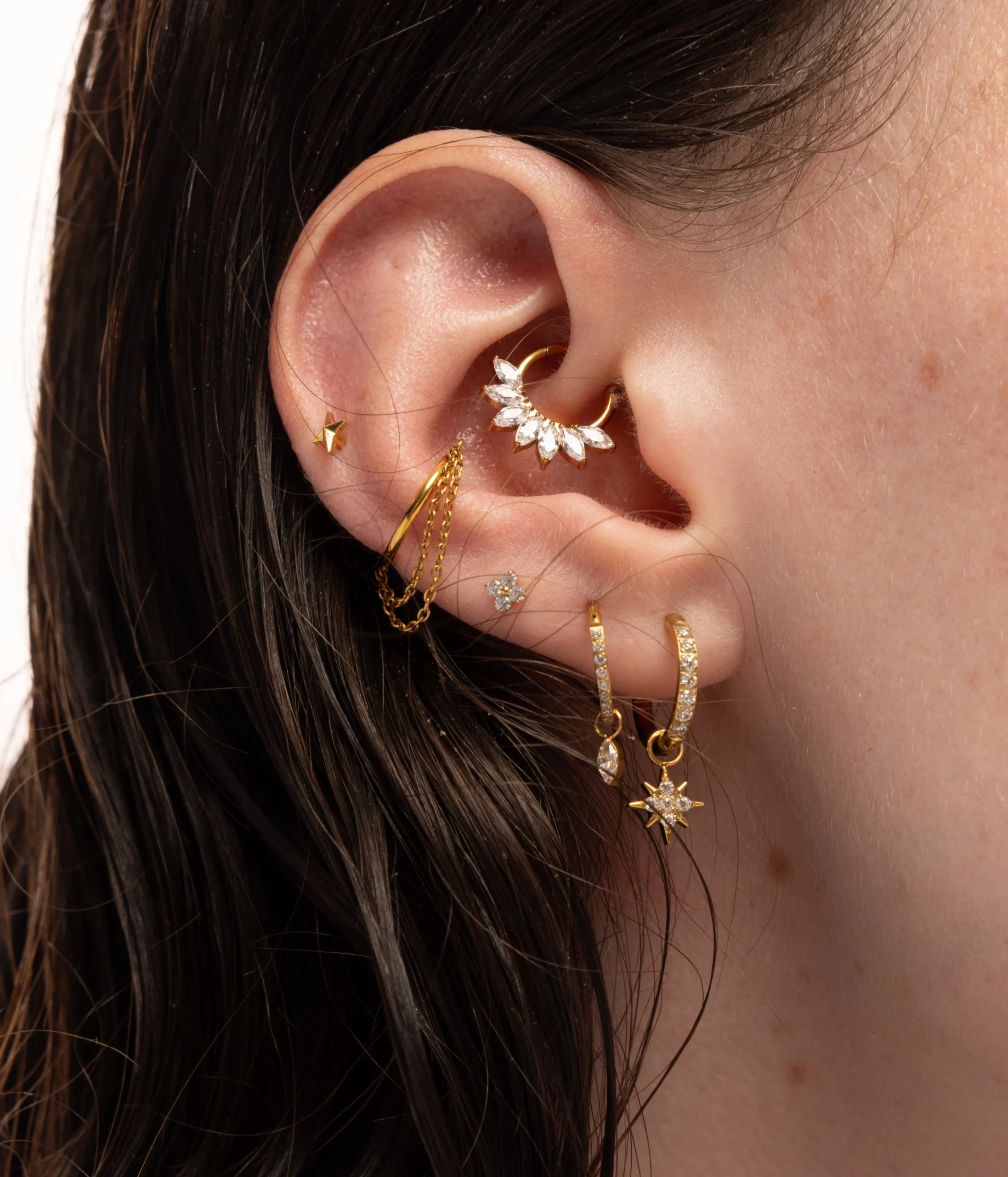 C’est le bijou parfait pour équilibrer une oreille trop symétrique ou donner du caractère à une sélection plus minimaliste. Ses zircons de grade 6A reflètent la lumière avec intensité, accentuant encore cet effet de contraste.