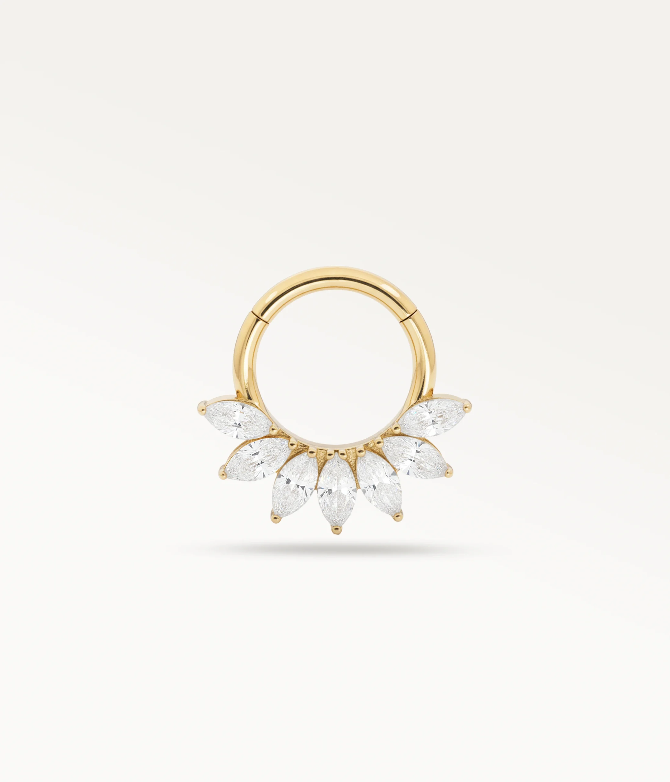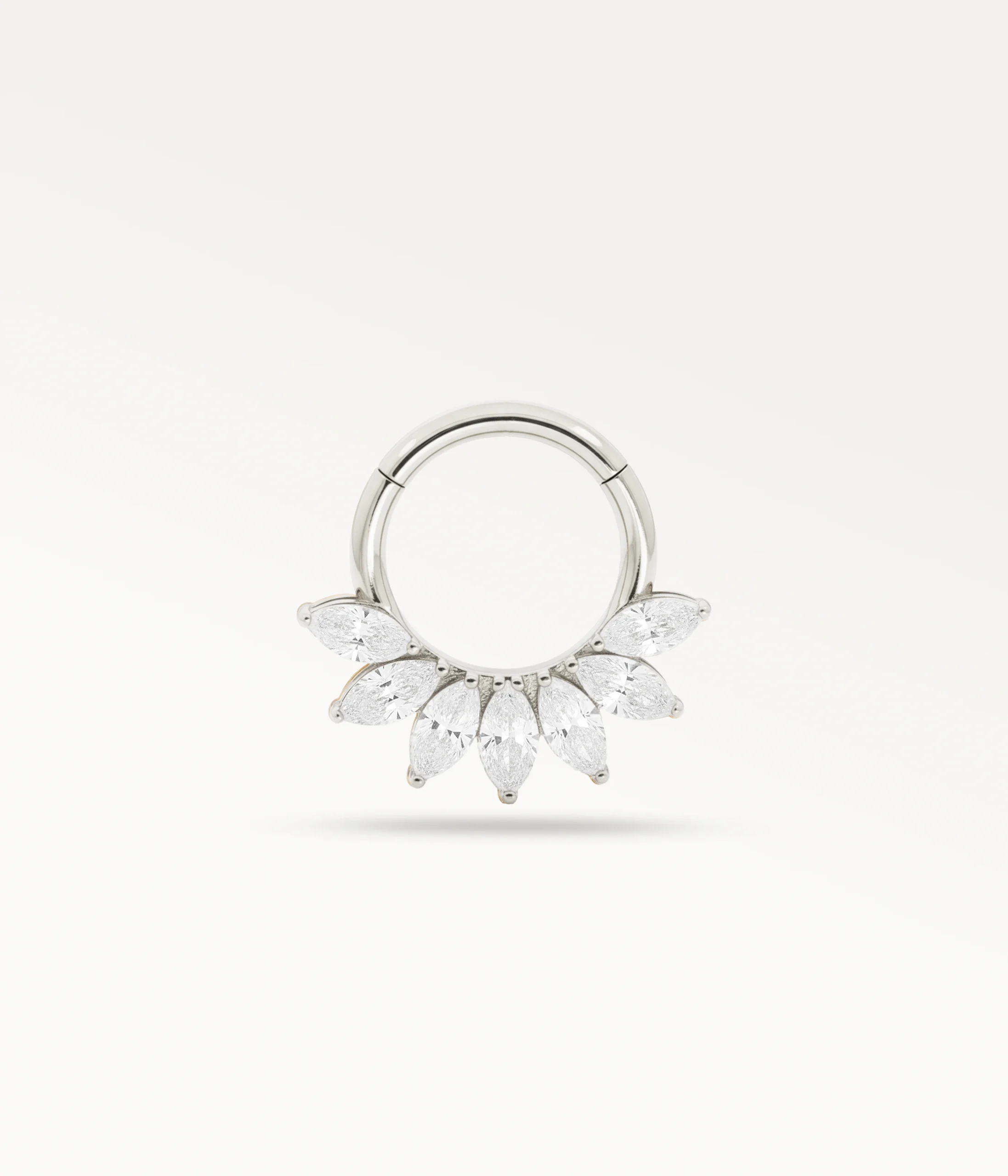 - Pierres : L’anneau est serti de sept zircons 6A en taille marquise, dont les facettes allongées reflètent la lumière avec intensité et structurent visuellement l’oreille