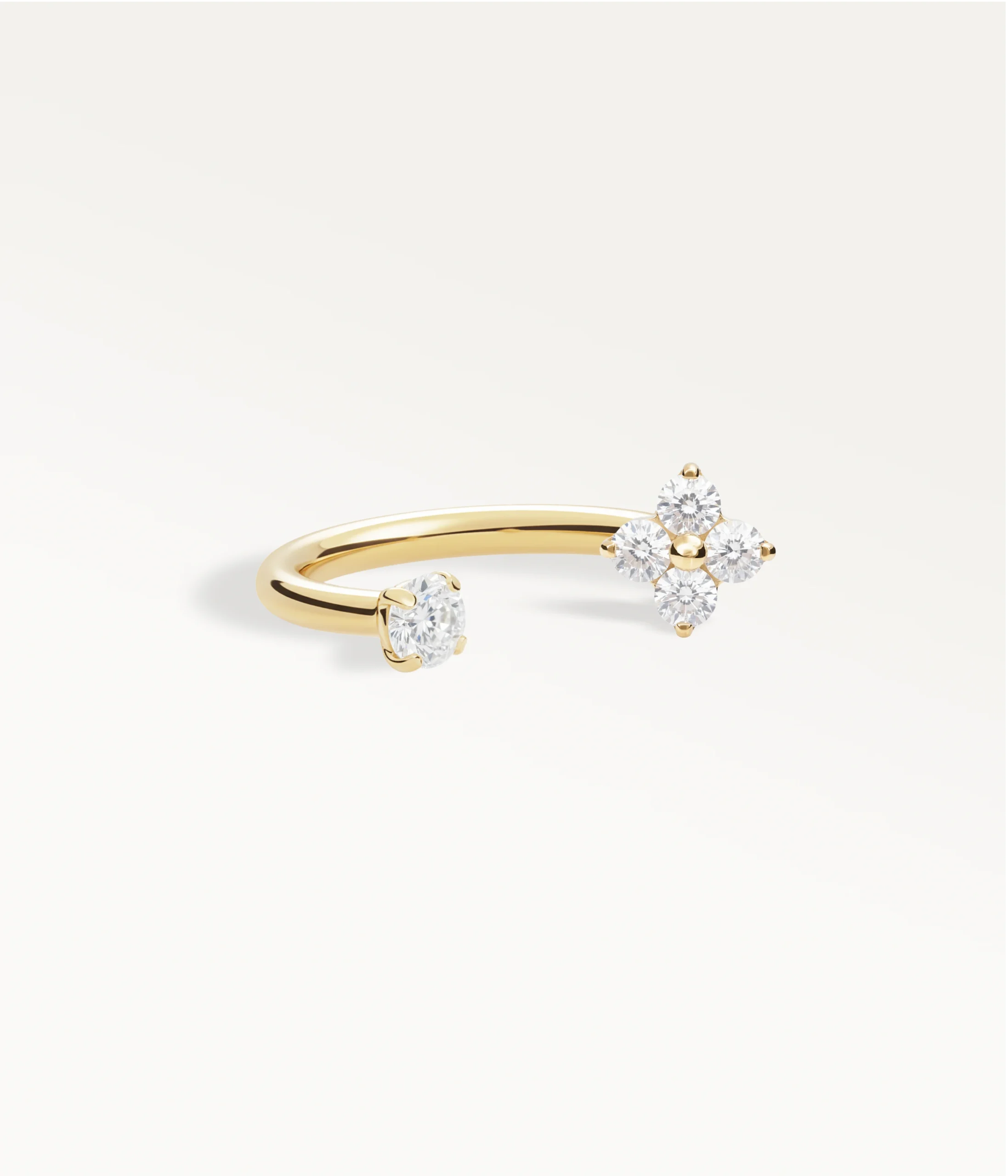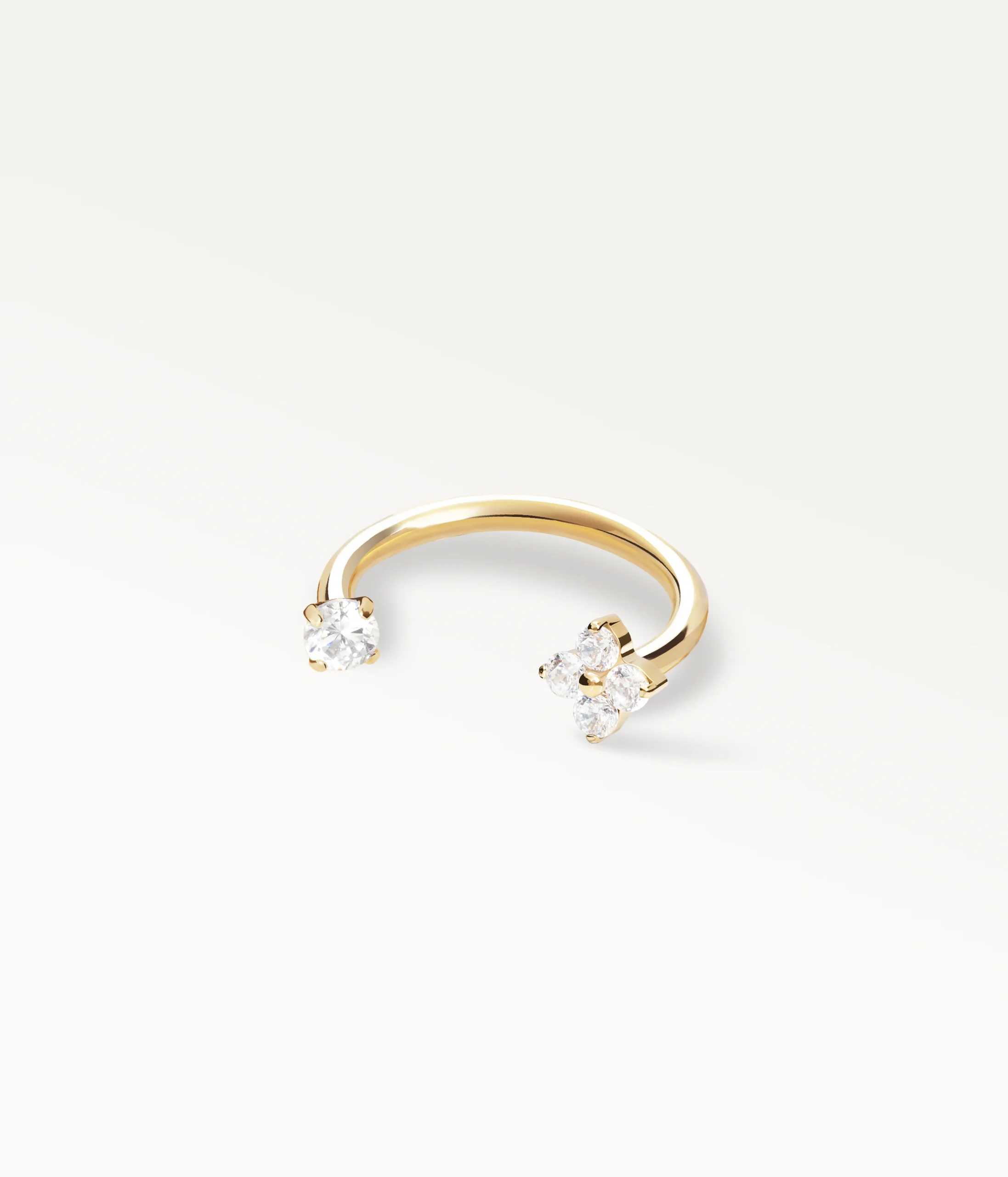 Espoir porte bien son nom. Ce bijou réinvente le piercing fer à cheval avec une symbolique forte : d’un côté, une pierre solitaire au charme épuré, et de l’autre, un trèfle à quatre feuilles, symbole de chance et de lumière.