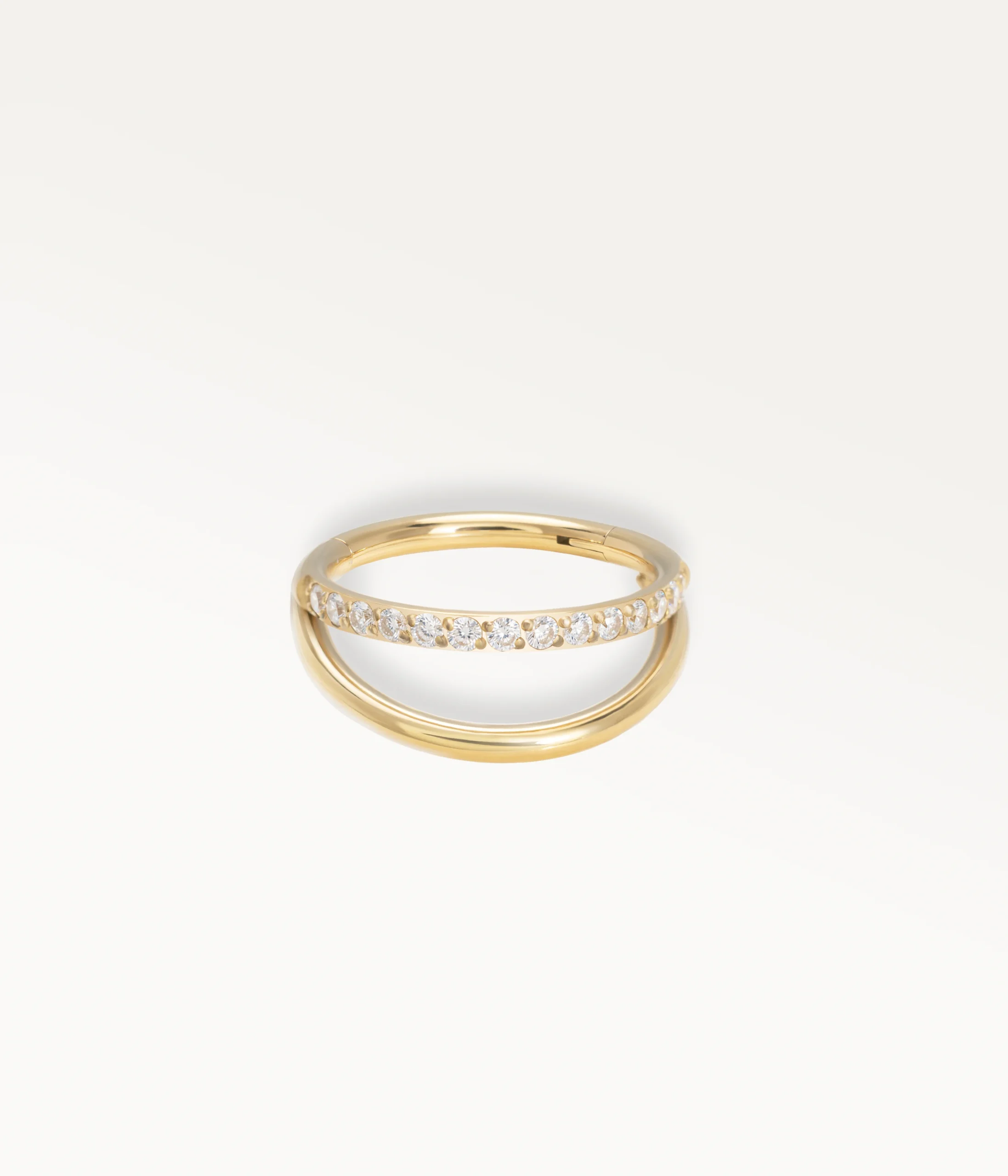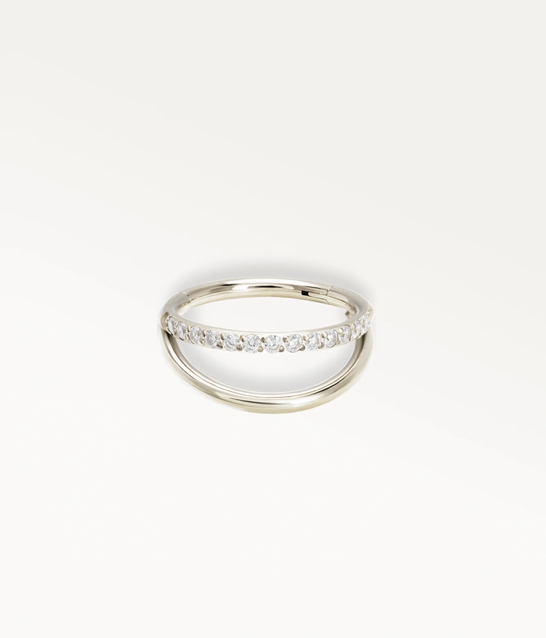 Pas besoin d’en faire trop : Mirage fait tout, toute seule. Son design donne l’illusion parfaite de deux anneaux superposés, l’un lisse, l’autre serti de zircons éclatants. Un équilibre simple, net, qui habille l’oreille en un geste.